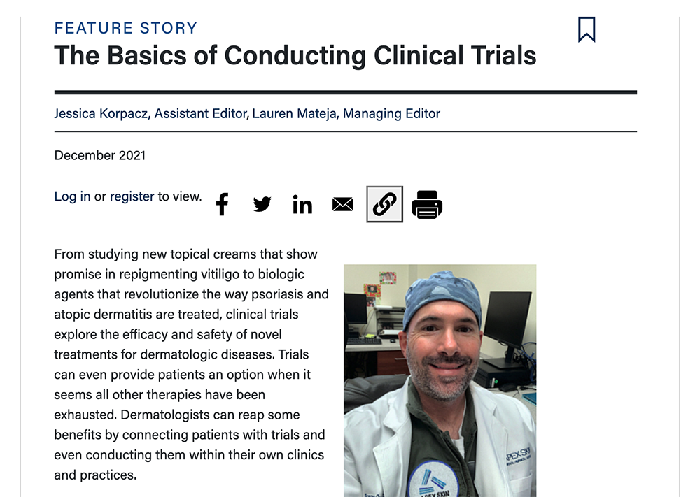 From studying new topical creams that show promise in repigmenting vitiligo to biologic agents that revolutionize the way psoriasis and atopic dermatitis are treated, clinical trials explore the efficacy and safety of novel treatments for dermatologic diseases. Trials can even provide patients an option when it seems all other therapies have been exhausted. Dermatologists can reap some benefits by connecting patients with trials and even conducting them within their own clinics and practices……